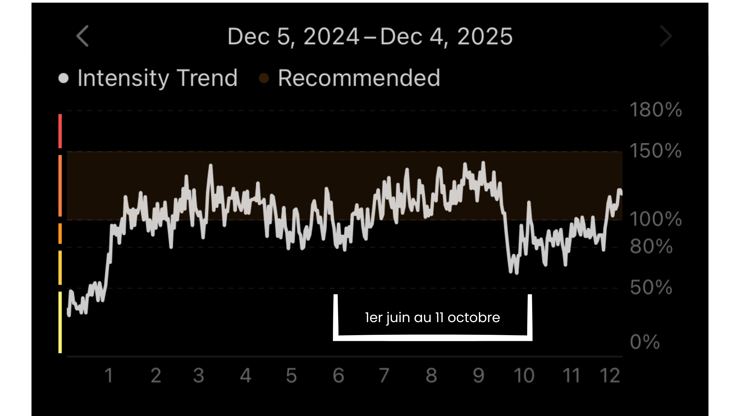 - J’utilisais ma montre COROS pour tracker mes séances, et je consultais particulièrement la section Training Status pour garder ma courbe Intensity Trend dans la zone Optimized.